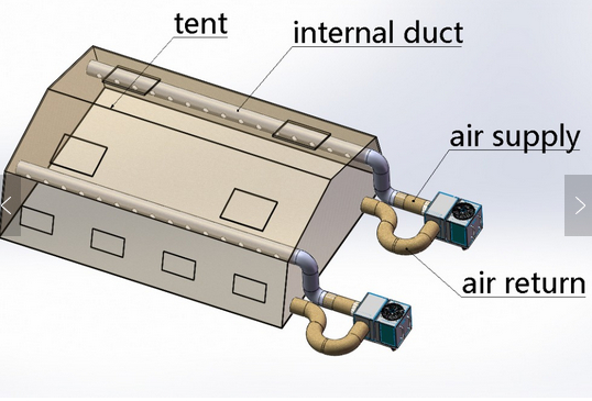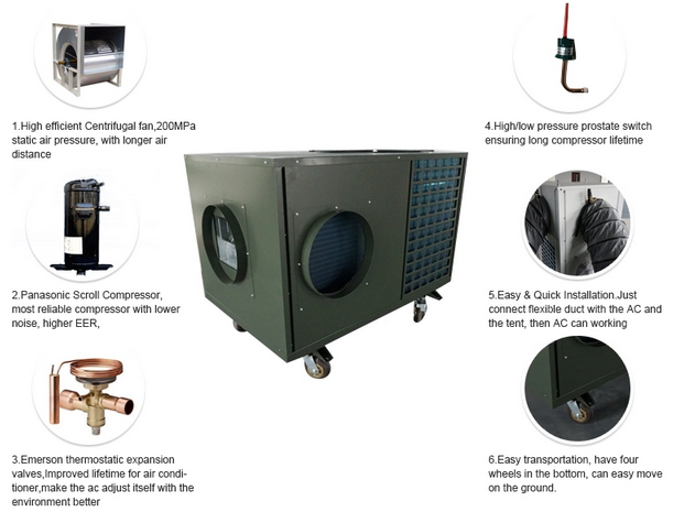 The tent air conditioner contains the evaporator and a centrifugal fan, which draws warm internal air of the tent through the cold evaporator and blows out the cooled air through the side or the top of the unit. The condenser section contains two condenser coils and a large axial fan, returning the heat taken from the internal air to the outside atmosphere.The Tent air conditioner also have heat pump,can supply warm air into the tent in winter. use the Panasonic scroll compressor, our Tent air conditioner can supply hot air at -10℃ to 20℃.